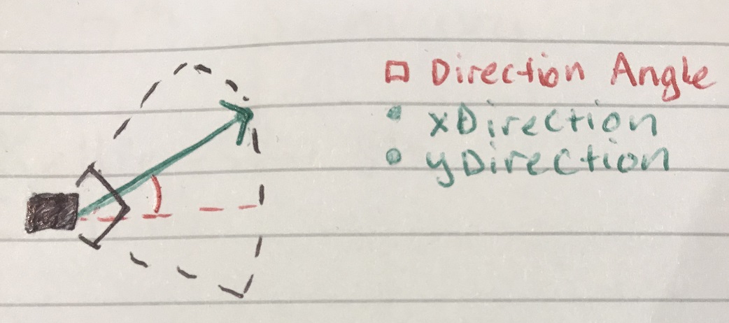 Each variable within a class is known as a field. The x and y fields will define the position of our creature. The xDirection, yDirection and directionAngle fields will define the direction in x and y that our creature will move.